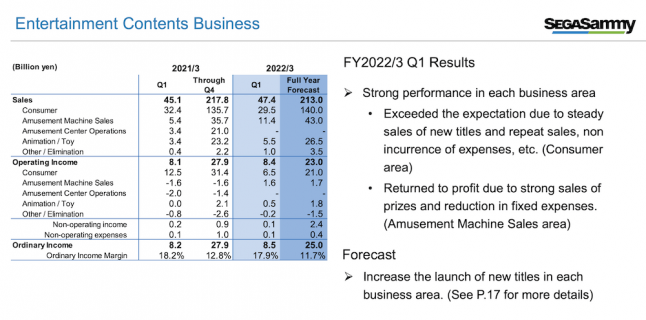 Overall, Sega explained the performance of its Entertainment Contents segment exceeded expectations, and is forecasting full-year sales of 213 billion yen ($1.9 billion) and operating income of 23 billion yen ($209.4 million) for the entire division.