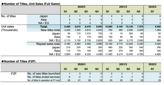 As the table below shows (top image), new game sales actually rose year-on-year to 1.06 million units from 790 million units, while free-to-play revenue increased to 12.4 billion yen ($112.9 million) from 11.1 billion yen ($101 million). Repeat sales of catalog titles, however, dropped to 5.52 million units from 12.19 million units.