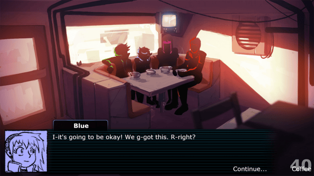 The artwork in the demo is already stunning; the coffee shop is atmospheric, the neon hair of the four party members bright against the shadows as they nurse adorably large coffee mugs. The music by veteran game composer Lena Raine (of Guild Wars 2 fame) is diegetic and can actually be discussed or changed by the characters over the course of certain conversations. It’s a powerful demonstration of minimalist game design in action, where a single image, some character portraits, and a score can bathe you in all the immersive beauty of the text-adventures of old.