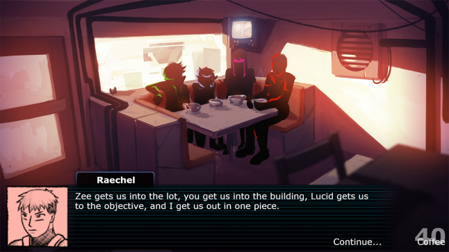 It’s a deceptively brief game that sees you shepherd a conversation between four Shadowrun-style infiltration experts before their mission–Raechel, the muscle; Lucid, the techie; Blue, the mechanic; Zee, the charismatic negotiator.
