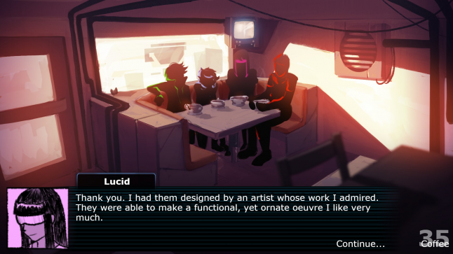The artwork in the demo is already stunning; the coffee shop is atmospheric, the neon hair of the four party members bright against the shadows as they nurse adorably large coffee mugs. The music by veteran game composer Lena Raine (of Guild Wars 2 fame) is diegetic and can actually be discussed or changed by the characters over the course of certain conversations. It’s a powerful demonstration of minimalist game design in action, where a single image, some character portraits, and a score can bathe you in all the immersive beauty of the text-adventures of old.