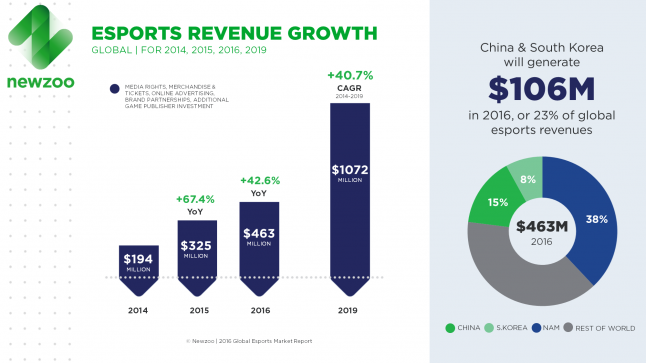 Looking ahead, the firm is effectively predicting a bit of a slowdown in global eSports revenue growth this year compared to the year prior, since Newzoo reports 2014-2015 saw a roughly 67 percent uptick in global eSports revenues — from $194 to $324 million. Whether it will once again revise its forecasts upward later this year remains to be seen.