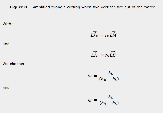 For each triangle of the mesh, given the height above the water of each of its vertices, we use the cutting algorithm to produce 0, 1 or 2 submerged triangles