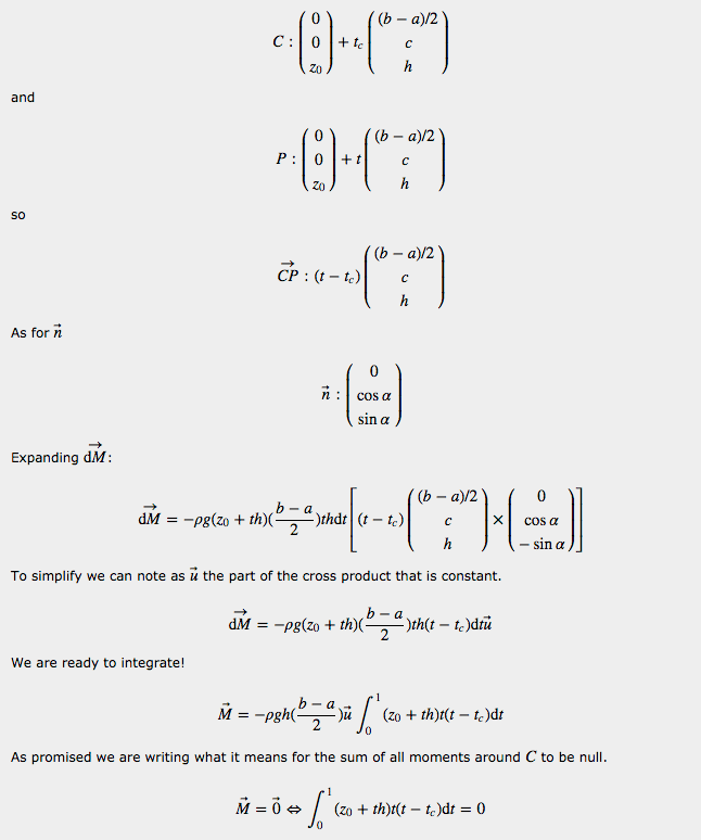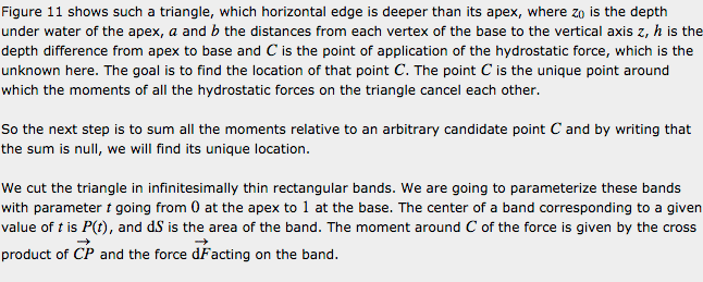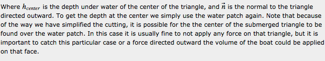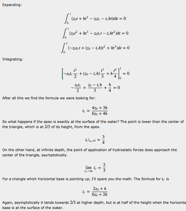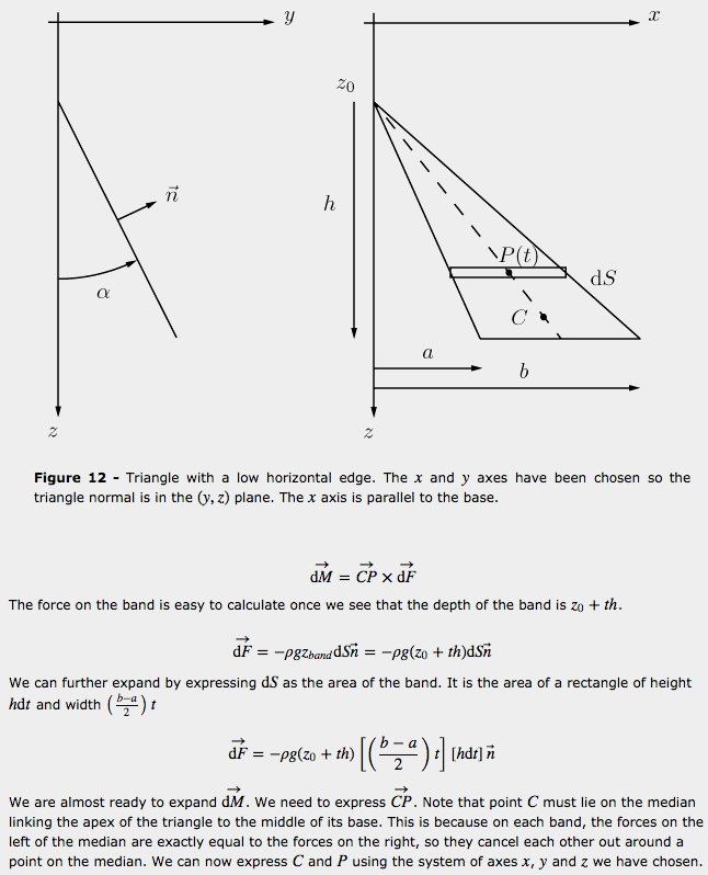 Now we are still missing one piece of the puzzle: to have everything we need to work on buoyancy, we also need the point of application of the hydrostatic force. The point of application of the buoyancy force is the point with respect to which the moments of all hydrostatic forces cancel out. If we continue reasoning in terms of small elementary surfaces on the submerged body, things become a little less obvious. Since the hydrostatic force gets larger the deeper you go, the point of application of the hydrostatic force on a given non horizontal surface is generally found lower than the center of the surface. As shown in Appendix A, on a submerged triangle, which is particularly useful in games since we tend to triangulate everything, the point of application is always lower than the center. Yet somehow the sum of all the moments of all these forces applied generally lower than the centre of any surface still cancel out around the centroid of the volume. A formal proof of this is found in [2] by applying the Ostrogradsky-Gauss theorem (**), or divergence theorem. It can also be verified numerically. The reason I mention this is that if you were to divide the body in small surfaces, say triangles, and sum all the hydrostatic forces and their moments, you could be tempted to make the simplification to calculate the moments as if the elementary forces on each triange were applied at its center (easy to determine). If you do so however, you will not get the correct result. You will get the correct force, but you will get a residual moment around the center of the volume submerged, and the boat may tip on one side at rest, even on perfectly flat water. This is especially true if you use a low polygon count mesh to reduce performance cost, as the error made on each triangle is then relatively important. On the other hand, if you have many small triangles, the error caused by the simplification will be reduced drastically and the simplification may become acceptable. But there is a trade-off between the complexity of the computation of the correct center and the number of triangles in the hull. Appendix A gives the formula for the location of the point of application of hydrostatic forces on a submerged triangle.