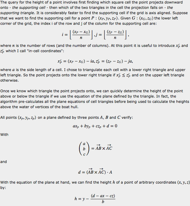We then calculate the height above the water of each hull vertex, by determining which triangle it is on top of, and using the plane equation of that triangle