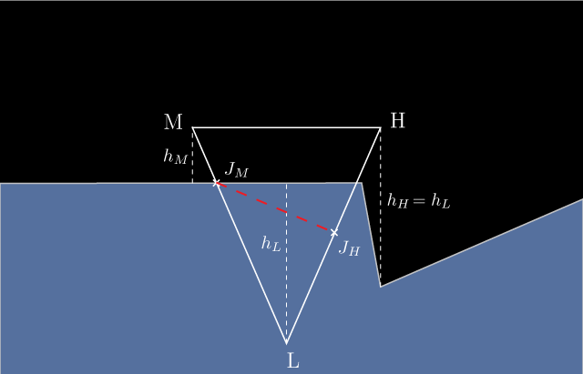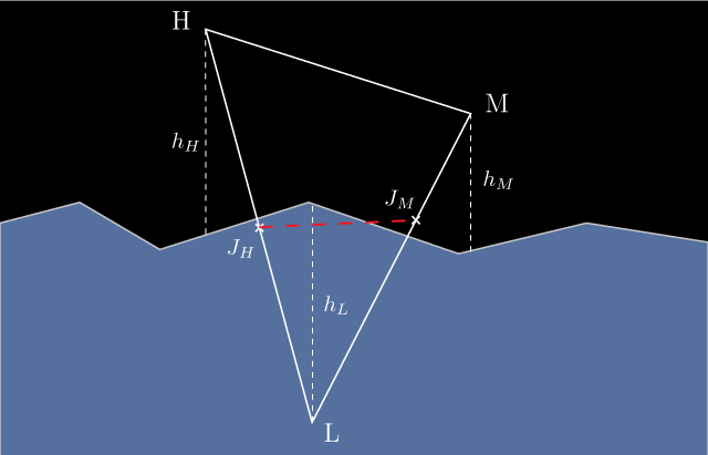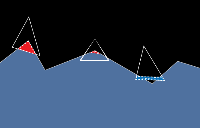 The structure of the optimized algorithm is as follows: the floating body is approximated by a triangulated mesh: the hull. We determine the height above water of each vertex of that hull. If the height above water is negative, the vertex is submerged. Triangles which three vertices are above water are considered to be entirely out of the water. This is a simplification, in reality the water could be above some part of the triangle but below all three vertices, as show in figure 4. Likewise, we consider a triangle to be fully submerged if all three vertices are under the water, even though some part of the water could be sinking under the triangle in some of its area. When only one or two vertices are under water, we cut the triangle into one region under the water and one region over, as shown in figure 2. If the region under the water is not a triangle, we further triangulate it. I am making the bold (and theoretically incorrect) assumption that the surface of the water is cutting the edge only once between a submerged vertex and a vertex out of the water. Figure 3 shows some examples of cases not accurately intersected. We end up with a list of triangles, all of which are under water. We then calculate the hydrostatic and hydrodynamic forces acting on these triangles.
