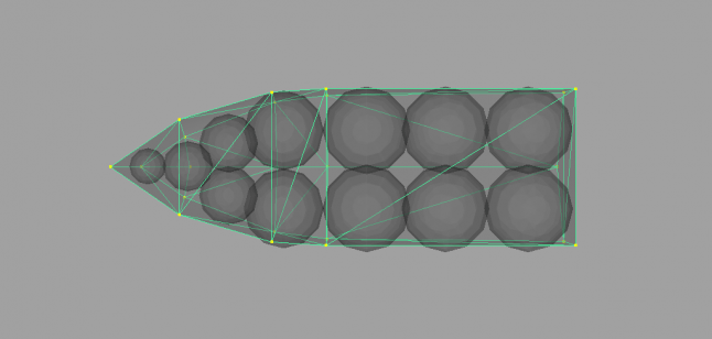 Both the volumetric and surfacic methods, without too much approximation, require us to determine the intersection of the water with the hull. This can be intimidating, especially when considering non flat water surface: it sounds expensive and complicated. This may be why the use of simple volume primitives is tempting to many. For instance, spheres: in contrast to intersecting a complex shape with the surface of the water, calculating the volume of a portion of a sphere submerged in water is fast and easy if the water can be approximated as planar around it. It can even be determined analytically, which means that, in theory at least, it is of infinite precision, or as precise as floating point operations will allow (yes, so many puns in this article). It also looks like the volume submerged will change in a continuous, progressive manner as the body moves in and out of the water, and continuity of a physical model is often desirable in games. But approximating the hull of a typical boat with spheres can quickly turn into a nightmare, as many spheres of different sizes may be needed. Because spheres are one of the worst choices for densely packing a volume, you will be left with significant gaps in between the spheres (figure 1). There is an upper bound to how densely the volume can be packed, even with spheres of different radii [5]. The presence of these gaps leads to noticeable irregularities in buoyancy. Spheres can also be made to overlap, but then the volume submerged will be overestimated. Finally, while it is easy to compute the intersection of a planar surface with a sphere, calculating the intersection of a sphere with an arbitrary water surface is much more work, and we might as well try and find a solution to intersecting the hull with water.