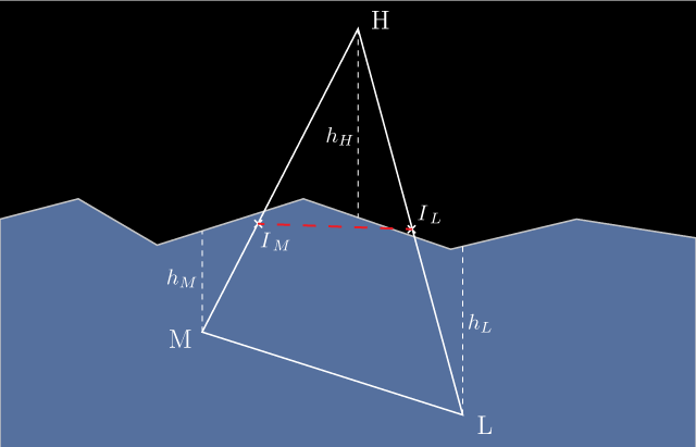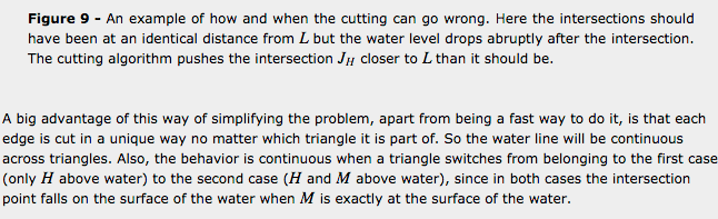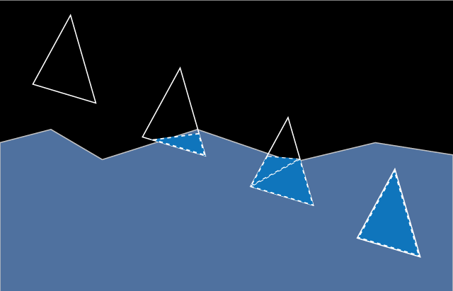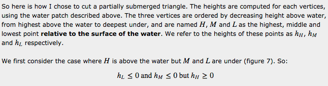The main objective is to determine the intersection between the surface of the water and the surface of the hull. After seeing the implementation by Edouard Halbert [1], I started by implementing an accurate solution taking into account all cases of the water surface intersecting a triangle. This problem is somewhat complicated because in theory there are lots of ways that a surface can segment a triangle. The surface could cut one triangle in several places, go through the center without intersecting any edges, or submerging any vertices. Each such submerged region needs to be triangulated, but those regions are not necessarily convex, so are harder (and slower) to triangulate. Furthermore, these cases are relatively common. Even in relatively calm waters they are very quickly encountered, and need to be properly handled in a way that doesn’t cause unrealistic discontinuities in the amount of surface considered submerged. After some effort spent implementing a perfectly accurate but very slow intersecting algorithm it became clear that I needed to find ways to simplify the algorithm without sacrificing too much of the general behavior. The algorithm I present here is the result of these simplifications. I will not present details of the first accurate algorithm because it is extremely tedious and boring, and ultimately the optimized algorithm works just fine and runs an order of magnitude faster.