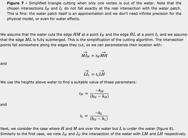 In the next section, we present important details of implementation, such as how to approximate the water surface to optimize the water depth query, how exactly to cut a triangle which has only one or two vertices under water and how the buoyancy forces are calculated.